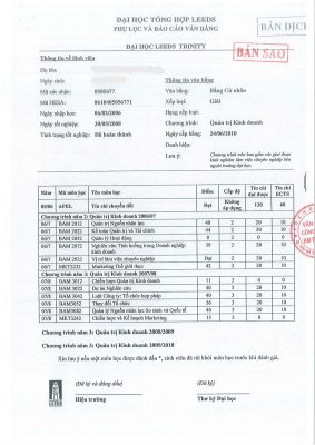 Bộ bản dịch bảng điểm (Photo công chứng)