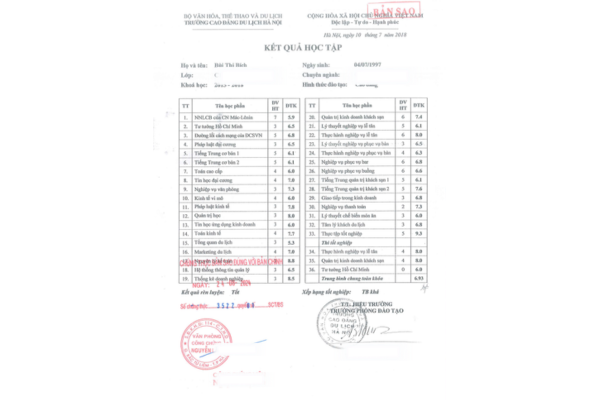 Mẫu bảng điểm Đại học photo công chứng