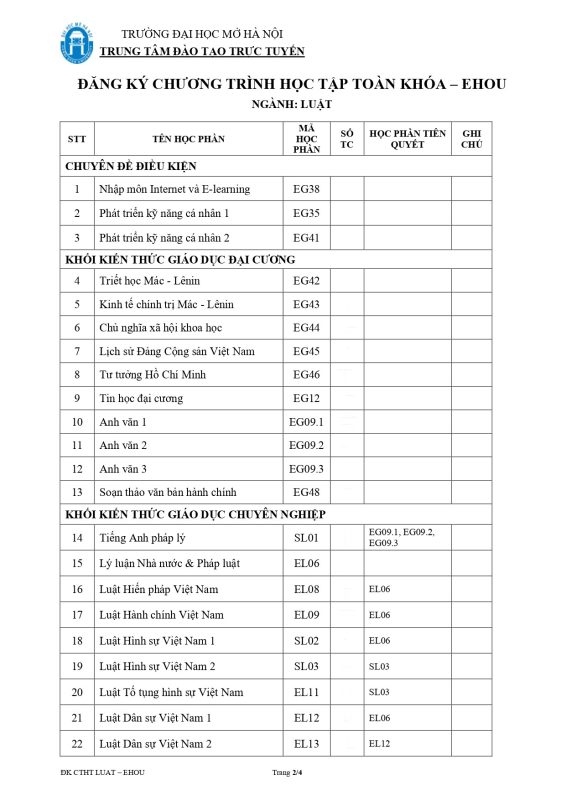 Khung chương trình học ngành luật – Trường Đại Học Mở Hà Nội