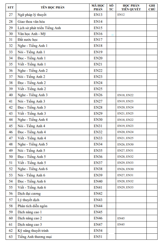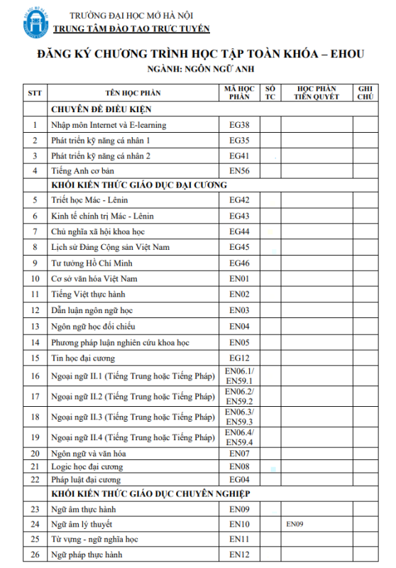 Khung chương trình học ngành Ngôn Ngữ Anh – Trường Đại Học Mở Hà Nội