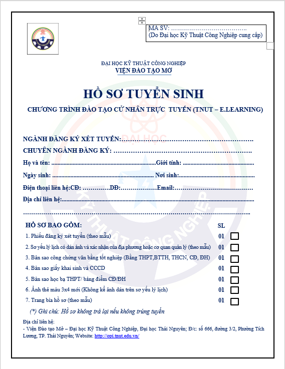 Hồ sơ đăng ký xét tuyển hệ từ xa Trường Đại Học Kỹ Thuật Công Nghiệp Thái Nguyên